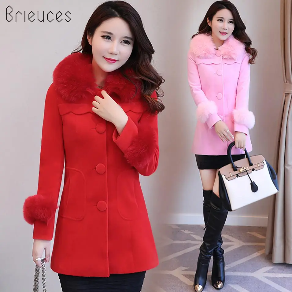 Brieuces 2017 Winter Woolen Coat For Women Fashion Solid Single Breasted Overcoat Fur Collar Slim Outerwear Female Trench Jacket