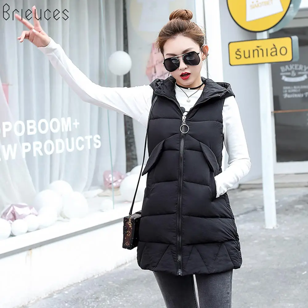 Brieuces 2018 hooded women winter vest long down cotton padded jacket warm autumn female pockets waistcoat new feminina colete