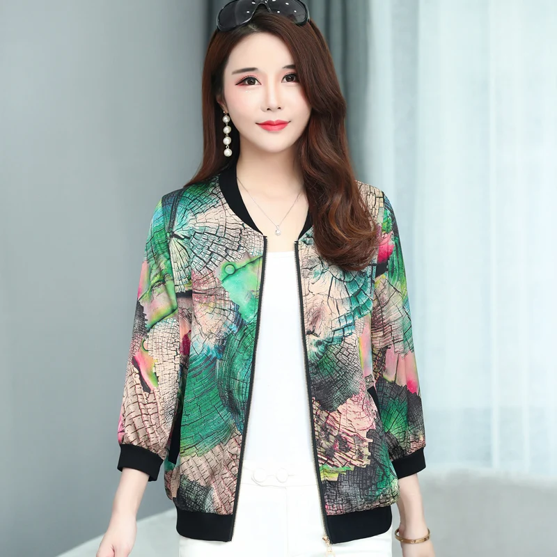 Good Chance for Brieuces Spring summer woman silk cloud jacket woman nine-point sleeve baseball uniform women's printed coat plus size S-5XL